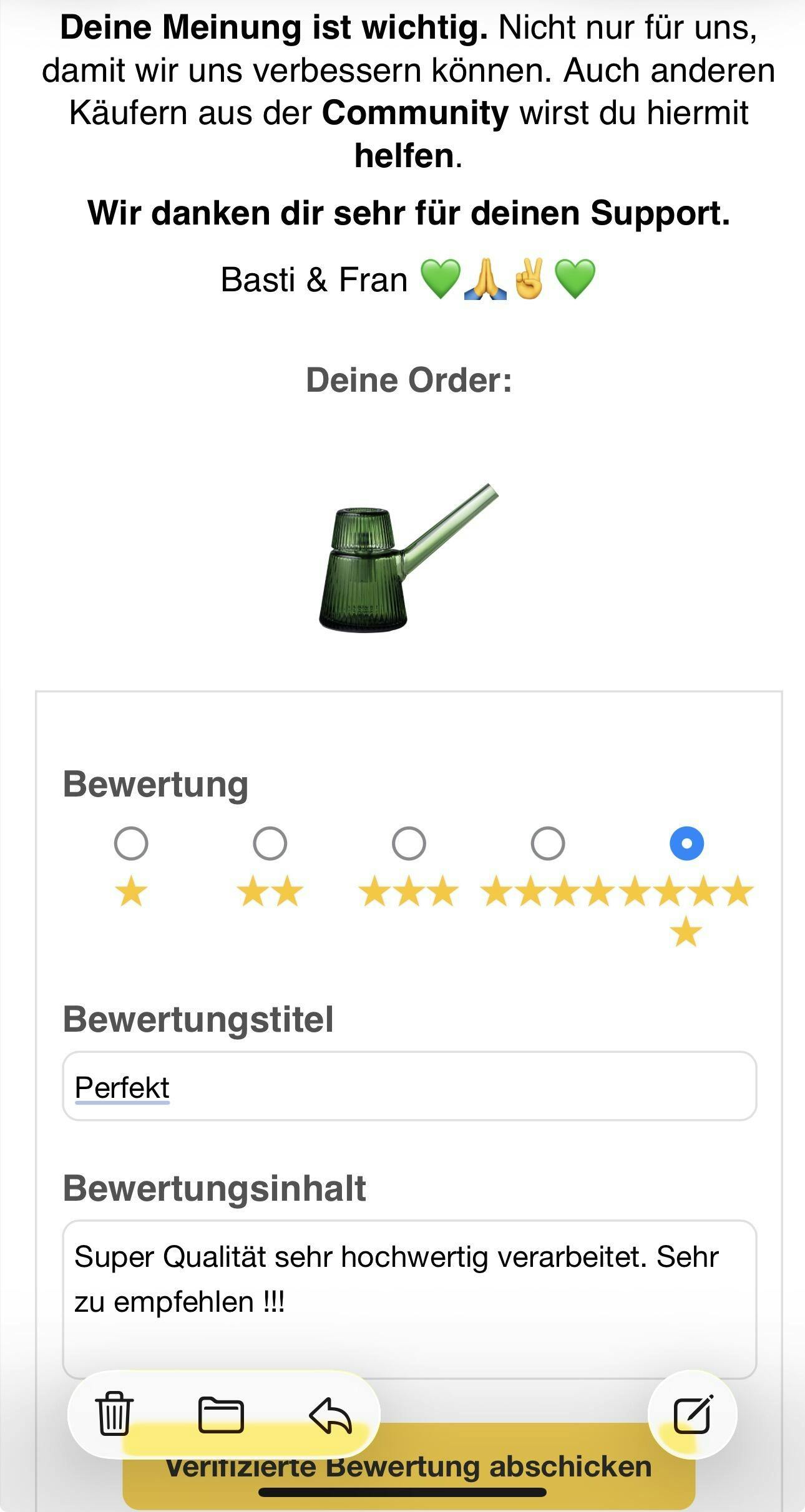ich habe jetzt seit ca. einer Woche die Session Goods Bong und ich bin verliebt. Die Handhabung und das einfache Reinigen sind genial. 2 Bowls in unterschiedlichen Größen sind perfekt um genau den richtigen Hit zu laden. Ich hoffe, das ihr bald auch den rest an Session Goods Produkten anbietet.