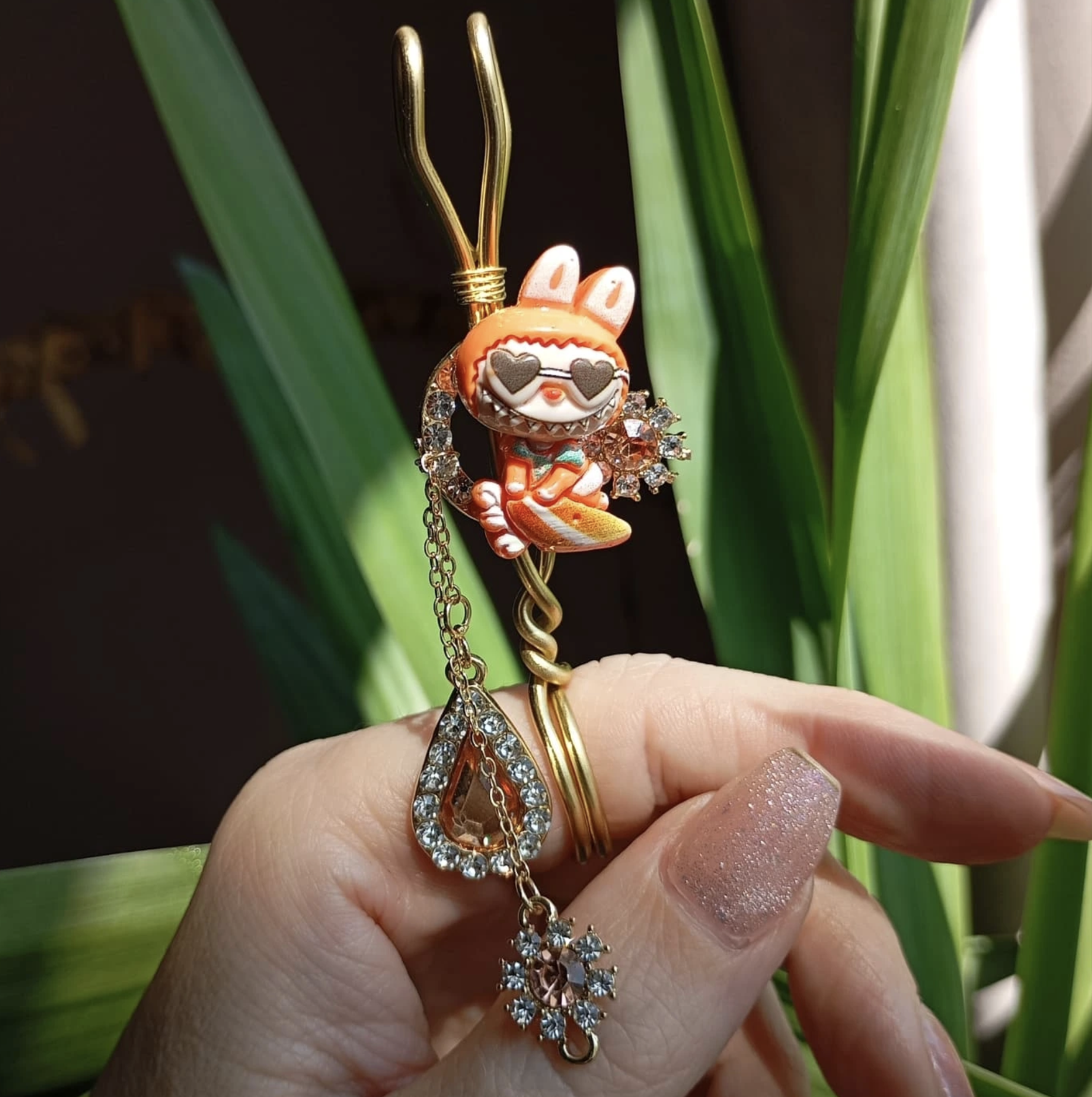 Material und Style: oranges Labubu auf asiatischem Vintage Haarschmuck / Jointhalter: Gebogener Schmuckdraht Gold / Ringhalter: ø19mm