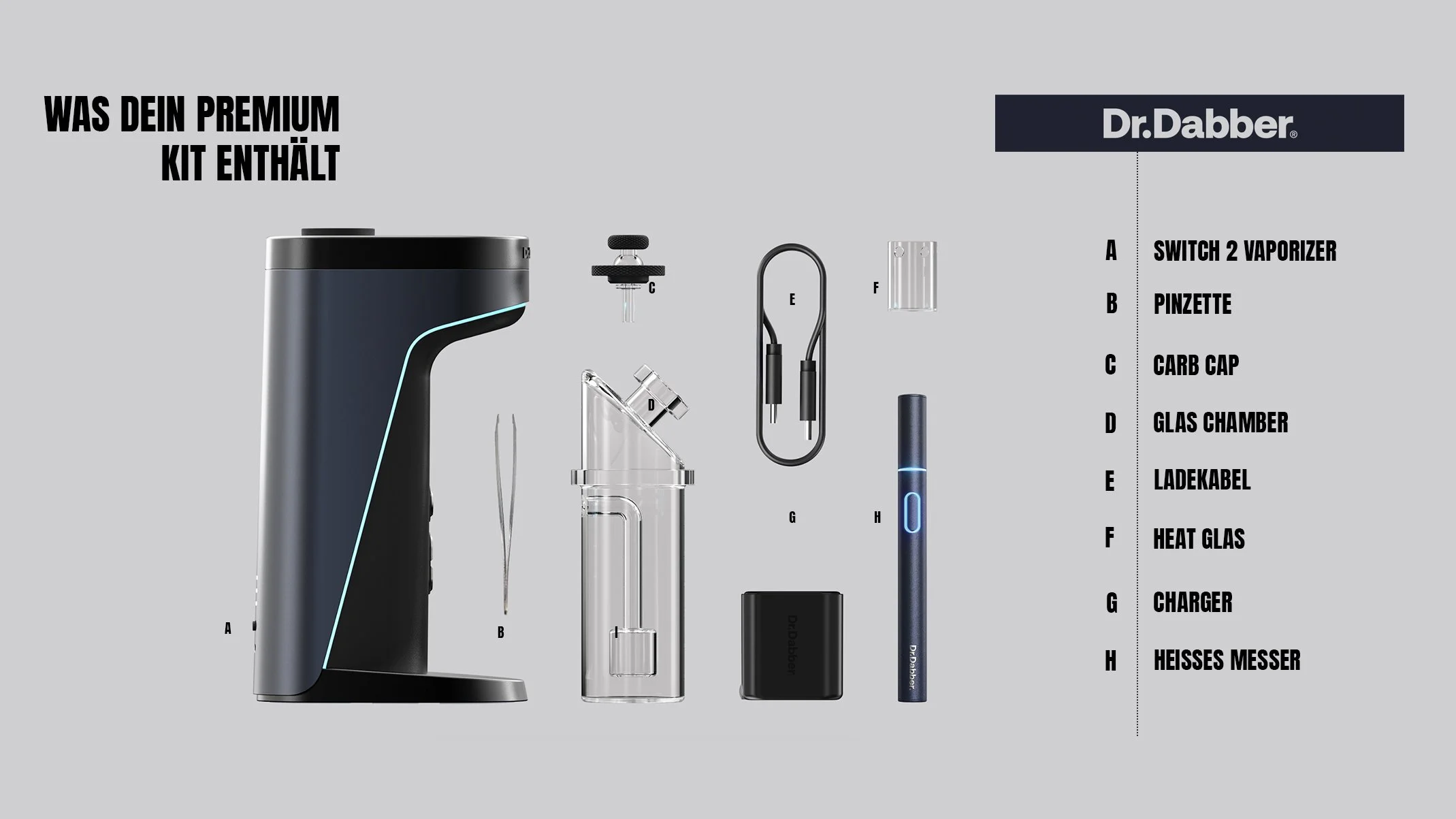 Inhalt der Box: Switch 2 Gerät, Quartz Insert, Ersatz‑Carb Cap, Ersatz‑Glass‑Attachment, Dr. Dabber Drop, Ladeadapter, USB‑C‑Kabel